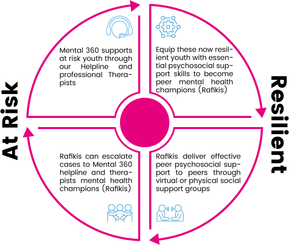 We empower at-risk youth to become resilient mental health champions dubbed Rafikis. This model guides them from vulnerability to resilience through a structured four-step process, emphasizing the power of peer support and professional intervention in managing mental health challenges.